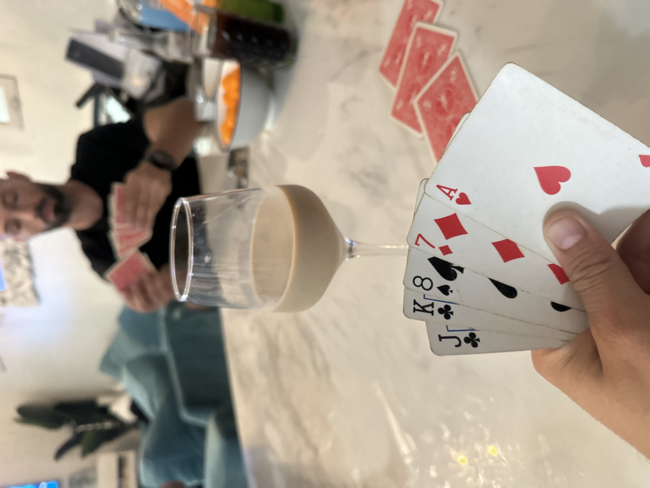 The scene is set indoors within the city of Fort Lauderdale, United States, depicting a leisure activity involving multiple individuals. In the immediate foreground, a human hand holds a fanned arrangement of five playing cards: Jack of Clubs, King of Spades, 8 of Spades, 7 of Diamonds, and Ace of Hearts, with a partial view of a sixth red-suited card. A stemmed glass, approximately half-filled with a beige opaque liquid, stands on a white marble-patterned tabletop. To the right of the cards held by the hand, a stack of four red-backed playing cards lies face down on the table. In the midground, a white bowl containing orange-colored snacks, a glass with a dark liquid beverage, and a green-colored container are visible on the table surface. In the background, a male individual with a beard and a dark short-sleeved shirt is seated, out of focus, holding a fanned hand of red-backed playing cards. Behind the male, light blue upholstered furniture, a dark potted plant, and light-colored walls adorned with decorative elements are present. The individuals are engaged in a card game.