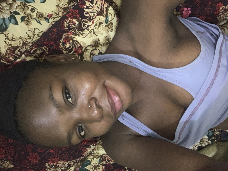 A woman with dark skin and a nose piercing smiles at the camera. She's wearing a light purple tank top and a black headband. She lies on a bed with a floral print comforter. The pattern includes cream, red, burgundy, and green flowers. Her expression is relaxed and welcoming.