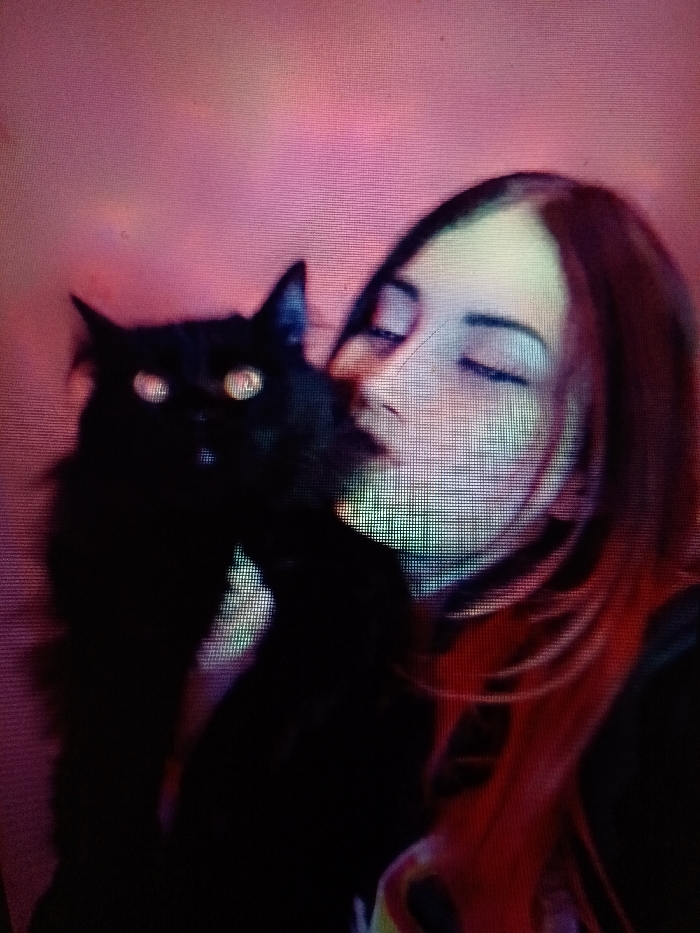 The image displays a close-up portrait of a female individual interacting intimately with a black domestic cat. The visual quality shows a prominent pixel grid, suggesting it is a photograph of a digital display. The person, viewed from the upper torso, has dark hair transitioning into vibrant red or pink dyed ends. Her eyes are closed, and her face is partially obscured by the cat's head. The black cat, with visible fur texture, has its head pressed against the individual's face, specifically near the nose and mouth, in an affectionate gesture. The cat's eyes exhibit a distinct yellow-green glow due to light reflection. The background is a soft, blurred gradient of pink and purple hues, offering no identifiable objects or architectural features. There are no discernible visual cues within the image to determine a specific location within the city of Toulouse, France; the scene appears to be an indoor setting.