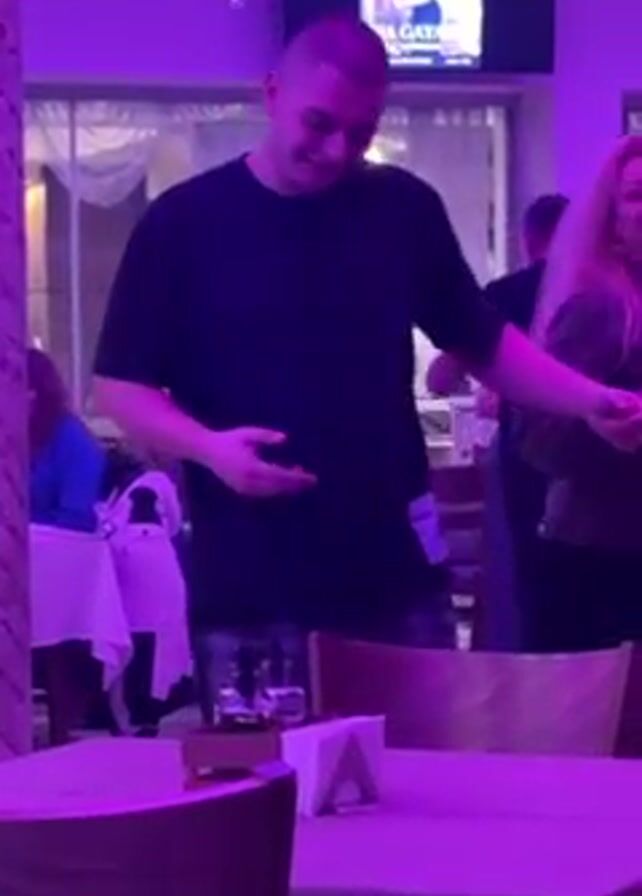 A medium shot shows a man dancing near a table in a restaurant