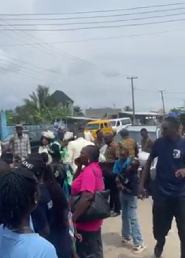 The video depicts a group of people gathered on a street, some of whom are wearing light blue T-shirts with the words "TOGETHER IN OUR ARTS" and "FOREVER IN OUR ARTS" printed on them. There are palm trees and power lines visible in the background. A man in a dark blue outfit appears to be dancing. Some individuals are wearing white traditional clothing. A motorcycle drives through the crowd. The video is shot in daylight.