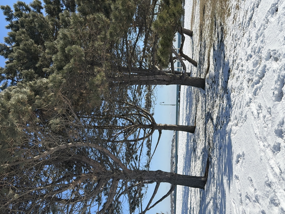 Three trees stand prominently, their trunks anchoring the scene. Winter's grip is evident with snow blanketing the ground. Through the trees, a body of water stretches to the horizon under a blue sky, with a distant light pole visible. The landscape displays a mix of bare branches and dense foliage, indicating a transition between seasons. The photo's tilted perspective adds an unusual slant to the wintery vista.