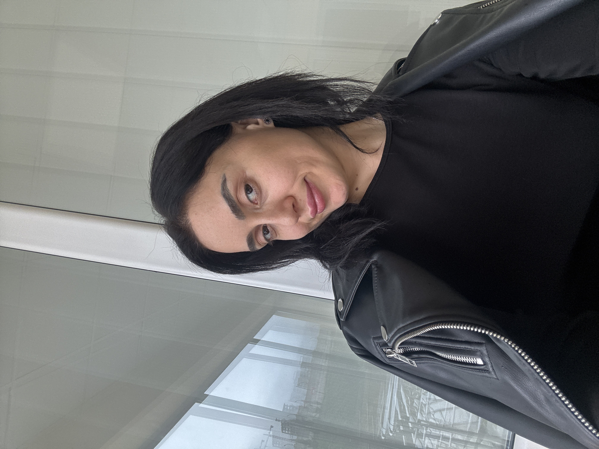 A woman with dark hair and skin stands indoors in front of a glass window. She wears a black top and a black leather jacket with a silver zipper. The window reflects a cityscape, suggesting the photo was taken in Tbilisi, Georgia.