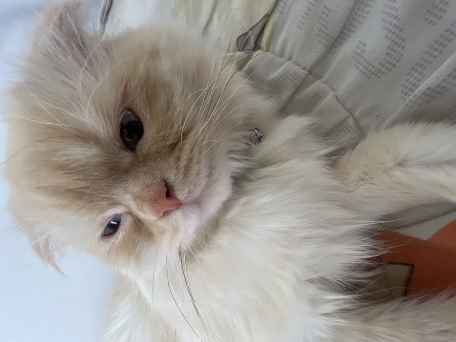 A cream-colored, long-haired cat is lying down, with its face close to the camera
