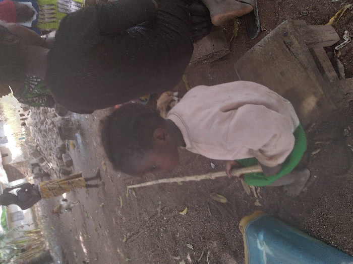 The image depicts an outdoor scene in Godogodo, Nigeria, characterized by a predominantly dirt ground and sparse vegetation under daylight conditions. In the immediate foreground, a young child, approximately a toddler, sits on a small, rectangular wooden stool. The child is clad in a light-colored, long-sleeved shirt and green shorts or pants, holding a long, slender stick with both hands, and is facing right. To the child's left, an inverted light blue object, possibly a plastic container or bucket, rests on the ground. To the right of the child, the upper back and right arm of an adult are visible, wearing a dark, possibly shimmering, long-sleeved garment. This individual appears to be seated on a low surface, with a bare foot and a dark flip-flop visible near the ground. In the midground, to the left of the seated individuals, another person stands facing away from the viewer, wearing a yellow and patterned wrap skirt, with their upper torso bare. Their arms are raised, and they appear to be carrying or holding something on their head or above. Near this individual's feet, a white and brown rooster is visible. The background features several structures, likely dwellings, constructed from what appears to be concrete blocks or mud. These buildings show varying states, some appearing rustic or partially constructed. Surrounding the structures and individuals, the ground is composed of dark earth or sand, with scattered debris including leaves, small stones, and what may be construction remnants. Trees and other foliage are visible in the distance.