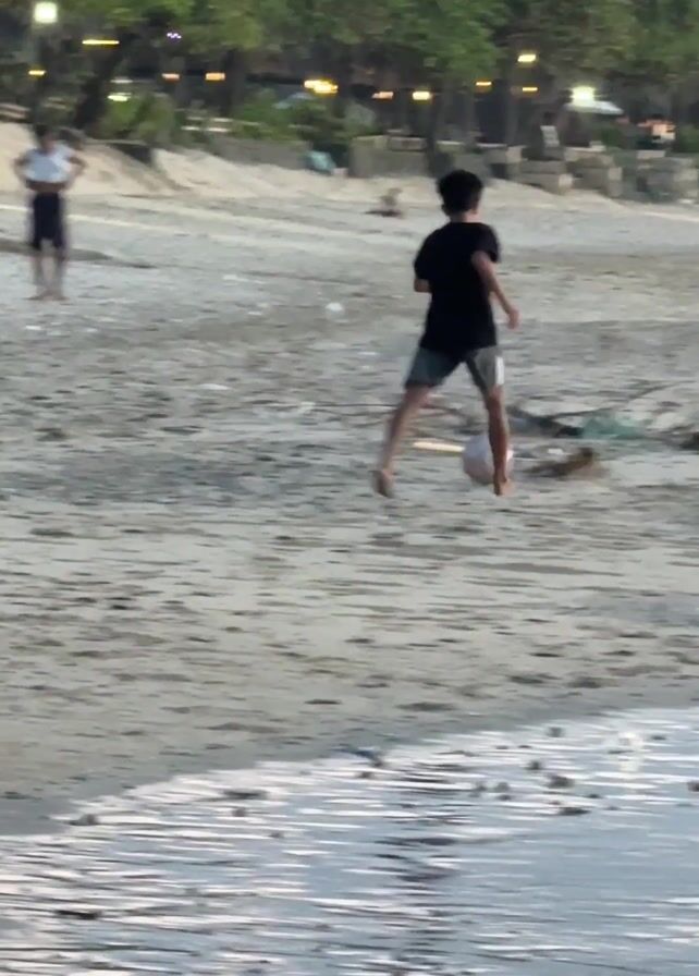The scene is a slightly cluttered beach at dusk. A barefoot boy in a black t-shirt and shorts dribbles a soccer ball away from the camera. He is the primary subject, moving from the foreground toward other beachgoers in the distance. The sand is speckled with debris and what appears to be wet patches from the tide. Trees with lights strung through them can be seen in the background. Another person, also barefoot and wearing a light-colored top and dark shorts, stands stationary further up the beach. The tide is coming in, and the water is close to the camera.