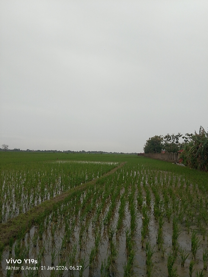 A verdant paddy field dominates the foreground, the young rice plants submerged in water. A narrow strip of grassy land cuts through the field. Beyond the paddy field, the horizon is lined with scattered trees. A wall and some vegetation mark the right edge of the scene. The sky is overcast, a uniform pale grey. The date "21 Jan 2026" is present at the bottom of the image.