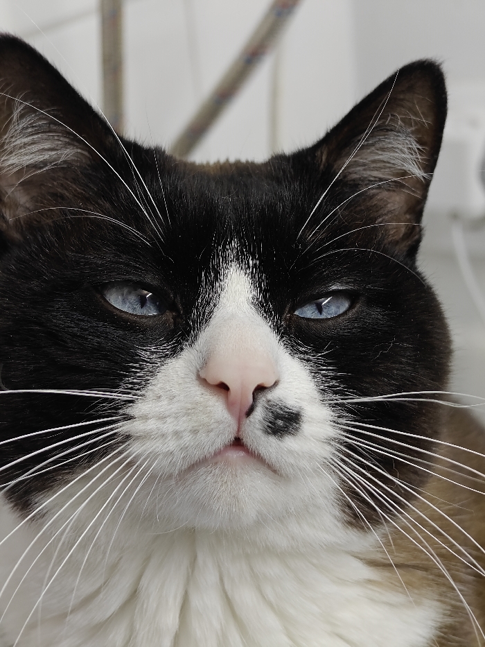 A close-up portrait of a cat with striking blue eyes