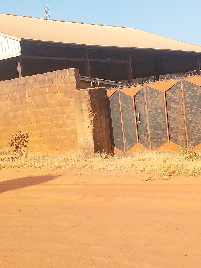 Location: City of Unknown, Unknown. The image depicts a sunlit, dusty, reddish-brown dirt road or path in the foreground, with patches of dry, yellowish grass along its edge. A dark shadow, likely from an unseen object to the left, extends diagonally across the road. In the midground, a weathered, reddish-brown brick or block wall runs from the left, terminating at a concrete pillar. A small, dry, leafy bush grows near the left end of the wall. To the right of the pillar, a large, multi-panel metal gate is visible. The gate panels are dark, possibly black, framed by orange-brown sections, and topped with a row of sharp, triangular spikes. A single, dark, vertical handle is present on one of the gate's central panels. In the background, behind the wall and gate, stands a large building with a light brown corrugated metal roof that slopes upwards. Exposed dark structural beams are visible beneath the roof, suggesting an open or partially open-sided structure. A metallic antenna array is visible atop the highest part of the building's roof against a clear, light blue sky. No people, actions, or direct interactions are visible in the scene. The environment appears dry and arid under bright daylight.