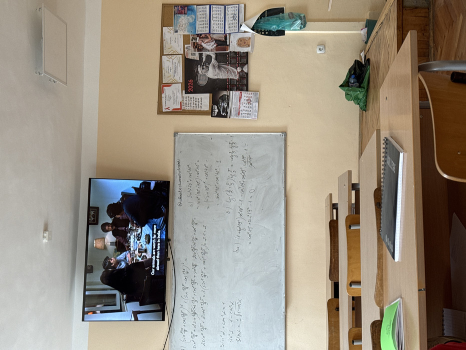 This image depicts a classroom in Haskovo, Bulgaria, characterized by pale yellow walls and a white ceiling. A large, wall-mounted flat-screen television on the left displays a scene from a film or show featuring four individuals seated around a table, with visible English subtitles stating, "Our animals are worth far more abroad than here in India." Below the television is a white magnetic whiteboard covered with handwritten mathematical equations, primarily trigonometry, including terms like 'sin', 'cos', and 'tg'. A username or watermark, `@obstestvoravulepedi`, is handwritten at the top right of the whiteboard. To the right of the whiteboard, a cork bulletin board is affixed to the wall, holding various papers, calendars (one for 2026 featuring a male tennis player, another depicting women in traditional attire), and several red and white ribbons. A light-colored wooden student desk is in the foreground, with a black spiral-bound notebook and a green open notebook placed upon it. Multiple similar wooden desks and chairs are arranged in rows, extending towards the background. The floor features a wooden parquet pattern. A small step is visible on the right, leading to a slightly raised platform, where a crumpled green plastic bag is resting. An electrical outlet is visible on the wall to the right of the bulletin board.