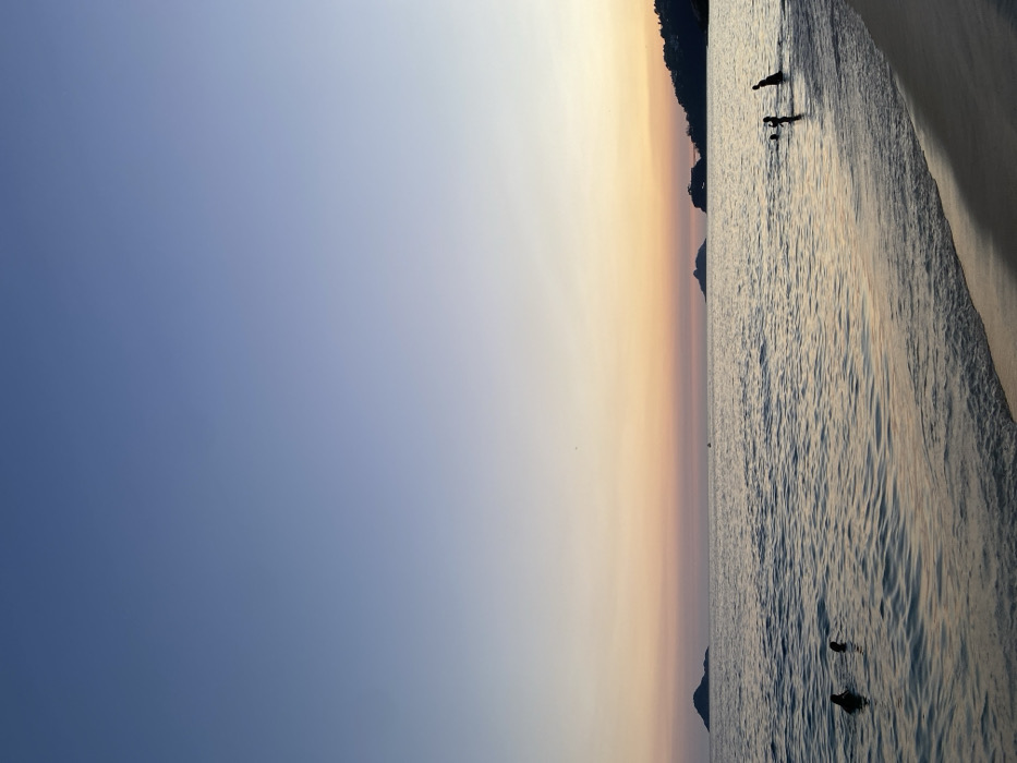 A serene, rotated landscape showcases a calm ocean meeting a sandy beach. Silhouettes of people dot the shoreline in the distance. The sky transitions from a deep blue to a soft gradient of orange and yellow near the horizon. Distant landmasses appear as dark shapes along the water's edge. The gentle ripples on the water reflect the warm hues of the sunset.