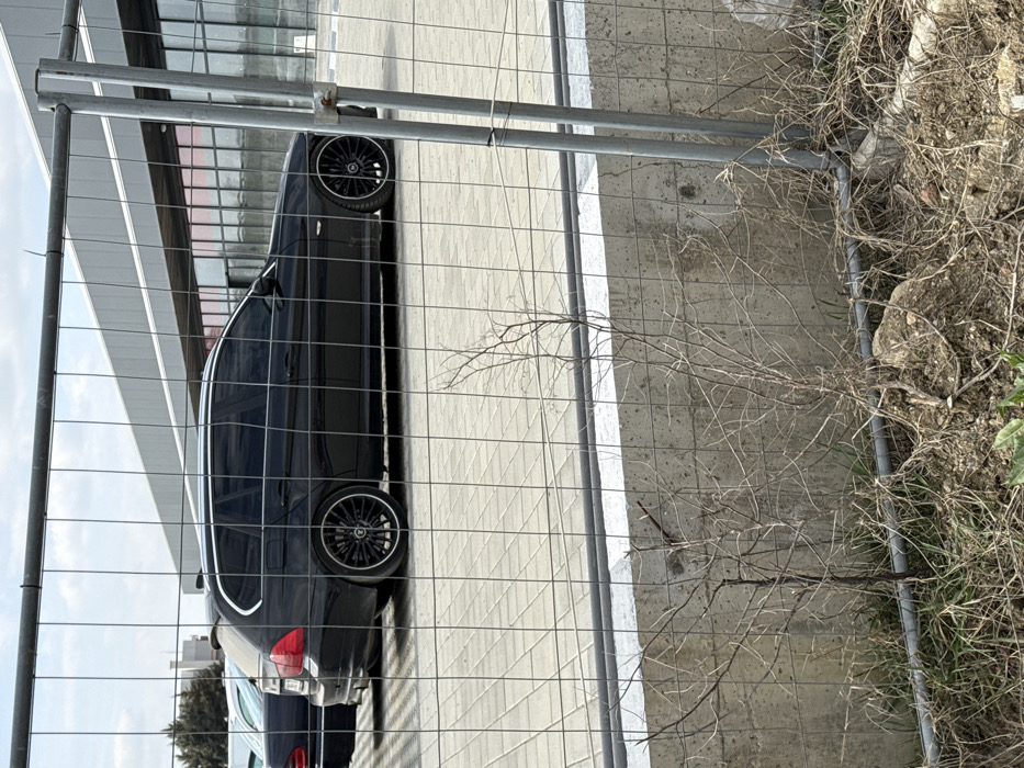 The image depicts a static scene captured through a temporary metal grid fence, located at the Lidl supermarket at bul. "Nikola Petkov" 5, 6100 Kazanlak, Bulgaria. In the immediate foreground, a strip of unkempt ground features dry, bare deciduous shrubs, sparse green weeds, dirt, and scattered debris. Above this, a concrete retaining wall with visible formwork marks separates the foreground from a paved parking lot. The metal grid fence, secured by a vertical grey post on the right, obstructs the view. Beyond the fence, a black BMW 3 Series Touring (E91 generation) is parked on a light grey paver-covered parking lot. The vehicle faces left, displaying its driver's side profile. It features tinted windows, black multi-spoke aftermarket wheels with a silver rim, a lowered suspension, and a subtle roof spoiler. Dust or dirt is visible along the lower body panels. A dark-colored Mercedes-Benz sedan is partially visible behind the BMW's rear section. In the background, a modern, single-story commercial building, consistent with a supermarket, presents a flat grey roof and large glass facade sections. Red elements are discernible behind some of the glass, suggesting interior design or signage. The sky above is partly cloudy with light blue patches. No individuals are visible in the scene.
