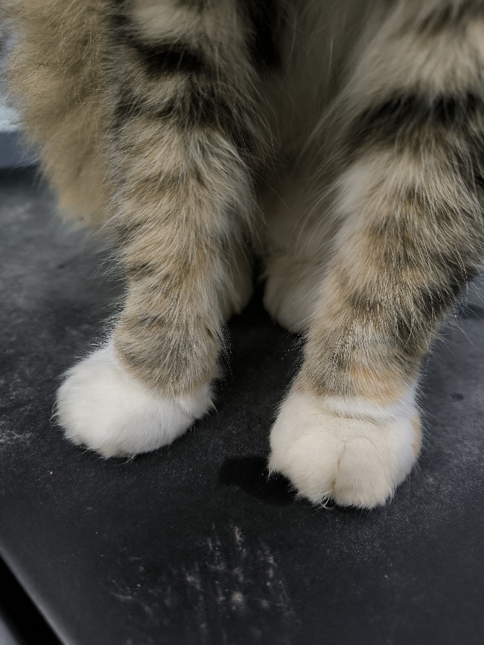 The image displays the lower body and front paws of a domestic cat