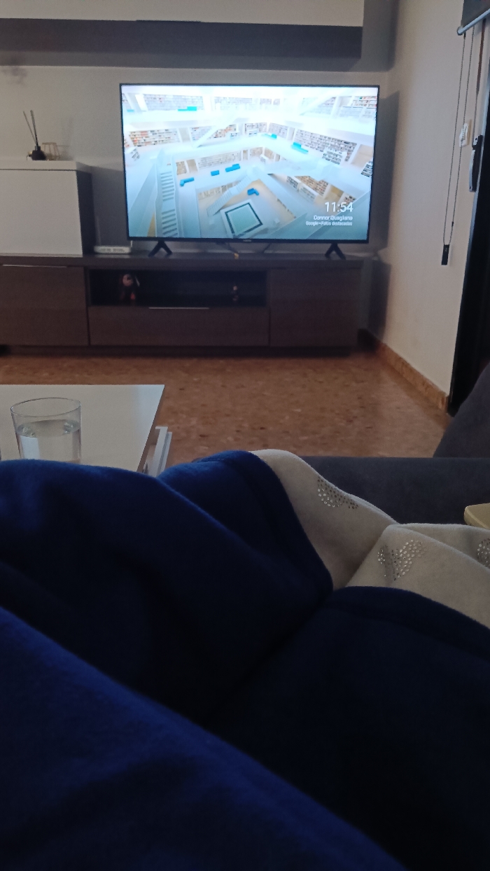 The image depicts an indoor scene, likely a living room, viewed from a low perspective. The specific location within Sagunto, Spain, cannot be ascertained from the visual evidence. In the foreground, the lower extremities of an individual are partially visible, covered by a navy blue blanket. A cream-colored blanket, adorned with a pattern of small, reflective elements, is draped over or adjacent to the blue blanket. To the right, a dark grey upholstered armrest of a sofa is partially visible. A clear glass filled with water rests on a white, rectangular coffee table in the lower-left quadrant. The midground features a large, flat-screen television positioned centrally. The television screen displays a digital image of a brightly lit, multi-level interior space, consistent with a modern library or architectural rendering, featuring numerous bookshelves and open seating areas. A digital clock "11:54" is visible on the screen, along with text fragments including "Connor Guegliano" and "Google Pixel Buddies." The television rests on a dark brown wooden entertainment unit or TV stand, which comprises multiple closed compartments and a central open shelf. A small, dark-colored figurine is discernible within the left section of this open shelf. The background shows a plain white wall. Above the television, a dark brown floating shelf or wall unit is installed. To the left of the television, on a white cabinet, a black diffuser with reeds is present. The floor is covered in a light brown or beige speckled terrazzo or tiled material with darker grout lines. On the far right, a dark vertical element, possibly a curtain or door frame, is partially visible, with a corded object hanging on the adjacent white wall.