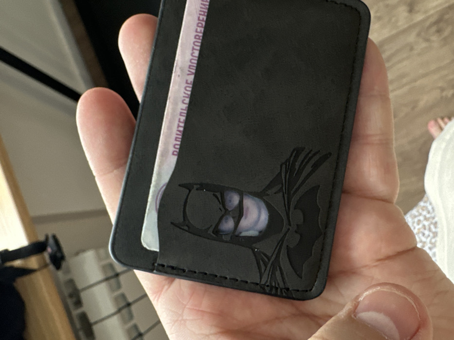 An indoor scene depicts a human's light-skinned hand holding a black, rectangular card holder. The card holder features a debossed or embossed image of Batman's head, cowl, and cape, with the iconic bat symbol on his chest. A card, identified as a Russian driver's license by the partially visible Cyrillic text "ВОДИТЕЛЬСКОЕ УДОСТОВЕРЕНИЕ" (Voditel'skoye Udostovereniye), is inserted into a slot. A light-skinned individual's face, possibly smiling, is visible through the eye cutouts of the Batman design, originating from the photo on the driver's license. In the blurred background, a light-colored wooden surface, likely a table or desk, is visible in the upper left quadrant. Below it, a white radiator with vertical fins is partially seen. Further back, a dark, amorphous object and a pair of dark shoes are present. The lower right portion of the background shows a blurred floor, appearing to be light-colored wood or laminate, with a bare foot and a portion of a light-colored garment visible at the very bottom edge. The lighting suggests an interior space. The image provides no specific visual cues to confirm the exact location within the city of Podolsk, Russia, beyond the Russian language on the driver's license.