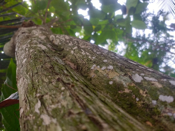 The image depicts a close-up, upward-angled view of a tree trunk in Mns Alue, Indonesia