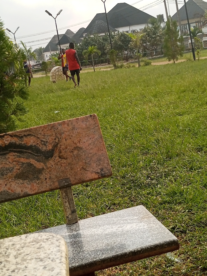 The image portrays an outdoor public green space or park in Owerri, Nigeria, under a bright, overcast sky. In the foreground, a granite bench is partially visible. Its backrest exhibits a reddish-brown hue with prominent dark grey and black veining, while the seat is a grey speckled granite. A smaller, lighter speckled stone surface is partially visible to the immediate left of the bench's seat. The midground features a large expanse of green grass, with varying heights of growth. Four adult males are observed in this area. One male, wearing a red tank top and dark shorts, walks away from the viewer, moving towards the right side of the frame. To his left and slightly behind him, another male, dressed in a yellow and dark-striped top, interacts with a light-colored, spherical object featuring a textured or caged surface, resting on the grass. Two additional males are partially visible further left within the grassy area. Two black lampposts, each equipped with twin luminaires, stand in the mid-to-background. The background reveals multiple modern buildings with dark, possibly tiled or shingled, pyramid-shaped roofs, suggesting a residential or commercial development bordering the green space. Various trees and shrubs, including palm trees, line the perimeter between the grass and the structures. A dirt path or unpaved area runs along the edge of the grassy expanse in front of the buildings. Faint utility lines are visible against the light sky.