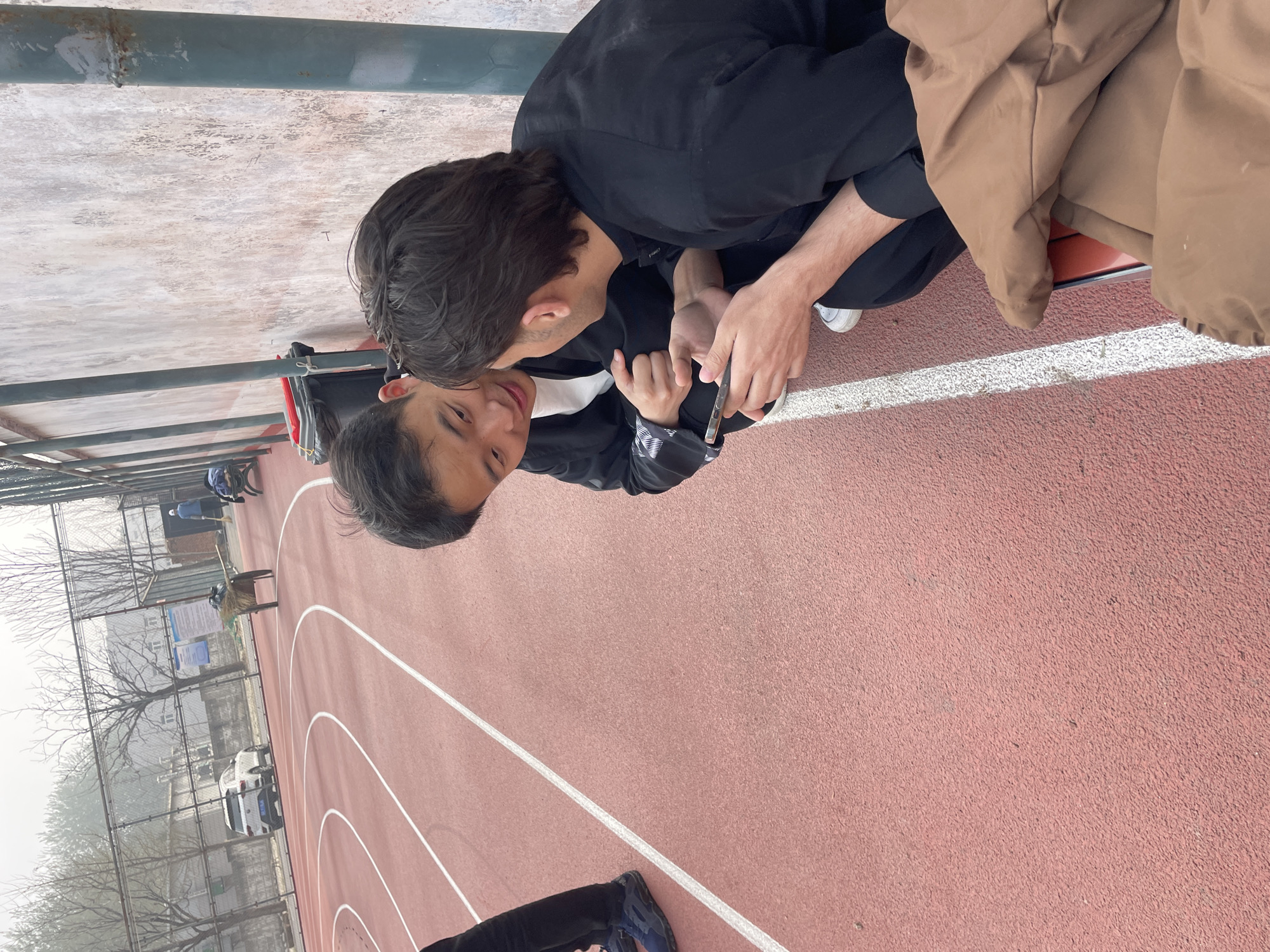 The scene is an outdoor sports facility, likely a running track, situated in Daxing District, China, under a hazy, overcast sky. In the foreground, two males are crouched or seated on the edge of a reddish-brown running track marked with white lanes. The male on the left, of East Asian descent with short dark hair, wears a dark jacket featuring white patterns on the sleeves, over a white undershirt. He is smiling and looking towards the male on his right, with his left hand slightly raised, possibly gesturing. The male on the right, with dark hair, wears a dark long-sleeved shirt. He holds a black smartphone with both hands, directing his gaze towards either the device or the male on his left. A brown jacket is draped across his lap. Behind the individuals, a weathered, light-colored concrete wall runs parallel to the track. Vertical metal poles support a chain-link fence situated behind this wall. A red and black trash receptacle is visible near the wall. Beyond the fence, a paved area contains a white Volkswagen SUV parked with its rear facing the camera. Numerous bare trees and indistinct buildings are visible in the background, partially obscured by the atmospheric haze. Further along the track, a person wearing a light blue top and dark pants is visible near a small cart loaded with a broom.