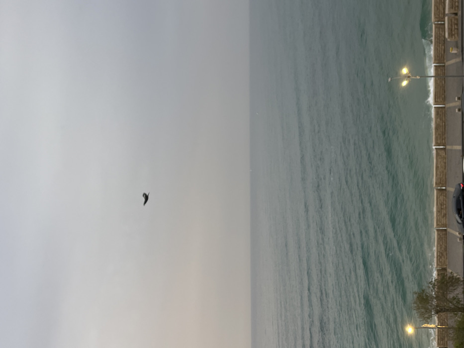 This image presents an elevated view of the Tel Aviv-Yafo coastline in Israel, looking out over the Mediterranean Sea under an overcast sky. A single dark-colored bird is suspended in mid-flight in the upper left quadrant of the frame, silhouetted against the muted grey sky. The sea occupies the central and lower-middle sections, characterized by undulating blue-green waves, with two indistinct white specks, possibly distant vessels, visible near the horizon line. The foreground features a segment of the Tel Aviv promenade, defined by a light-toned, block-stone retaining wall. A paved surface, likely a road, runs parallel to the wall immediately behind it. A dark-colored sedan is partially visible on the left side of this surface, heading right, alongside a lighter vehicle partially visible further to the right. An illuminated double-headed street lamp, emitting a warm yellow glow, is positioned on the right side of the promenade, contrasting with the overall diffuse natural light. A small tree or bush with sparse foliage is present on the left side near the retaining wall. Small white-capped waves are observed breaking against the immediate shoreline beneath the retaining wall. No people are visible.
