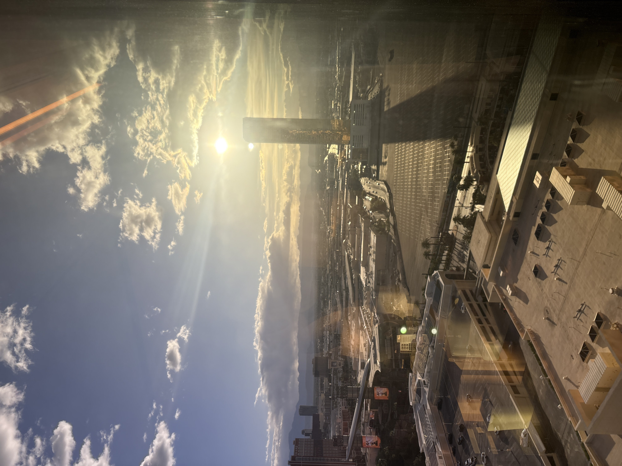 The image captures an elevated perspective of the Las Vegas cityscape in the United States, seen through a reflective window, with a view dominated by a bright, sunlit sky filled with scattered clouds. The sun is positioned near a tall, slender building. The city is visible below, marked by numerous structures, roads, and open areas. The presence of a reflective surface creates a double exposure effect, integrating the urban landscape with the sky. Adjacent to the window are visible structures and rooftops, typical of a building complex. The overall composition presents a mixture of natural and architectural elements under intense sunlight.