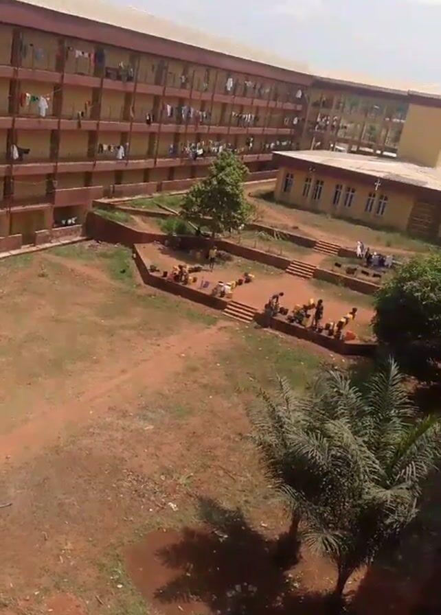 The video presents an elevated, wide-angle view of a courtyard within a large, multi-story building complex. The buildings have multiple floors with individual balcony spaces, from which clothes hang to dry. The courtyard is primarily composed of red earth, punctuated by small trees and other greenery. A series of steps lead down to a lower level within the courtyard, where several individuals are gathered, placing or moving black buckets. The sky is overcast, and the overall setting appears to be a dormitory or similar residential complex, possibly a university.