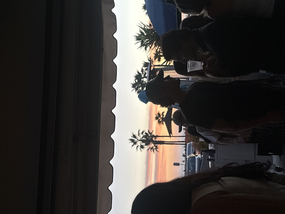 A scene framed by a shadowed awning and filled with silhouetted figures. Palm trees are silhouetted against a vibrant sunset of orange and pink. The figures appear to be people gathered together, possibly at an outdoor venue. One person is holding a cup. The scene suggests a relaxed, social atmosphere enjoying the sunset.
