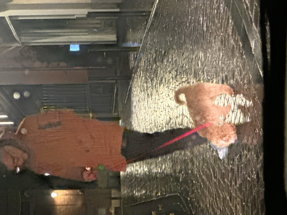 The image displays a nighttime street scene in Saint-Germain-en-Laye, France, characterized by a wet, reflective cobblestone surface. A single individual walks from left to right, wearing a reddish-brown long coat, dark trousers, and glasses. Their left hand holds a green object. A small, light brown, curly-haired dog walks ahead of the individual, attached by a bright pink leash. The dog has its head lowered, appearing to sniff the wet ground. The cobblestone street reflects ambient artificial light sources. In the background to the left, a building shows an orange light. To the right, a dark gate stands before a light-colored building with a visible blue light emanating from within or behind it.