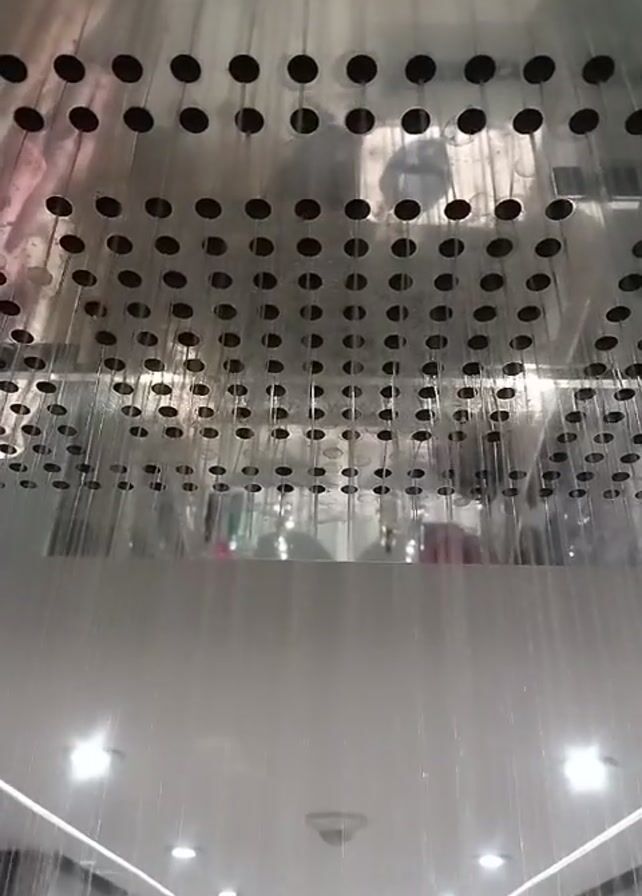 low-angle view looking up at a large, square rain shower head with numerous small holes. Water is streaming down from these holes, creating the effect of rainfall. The shower head appears to be made of polished metal, reflecting the environment around it. Below the shower head, the ceiling is visible, featuring recessed lighting and decorative linear lighting elements. The overall setting appears to be a modern, high-end bathroom or spa environment.