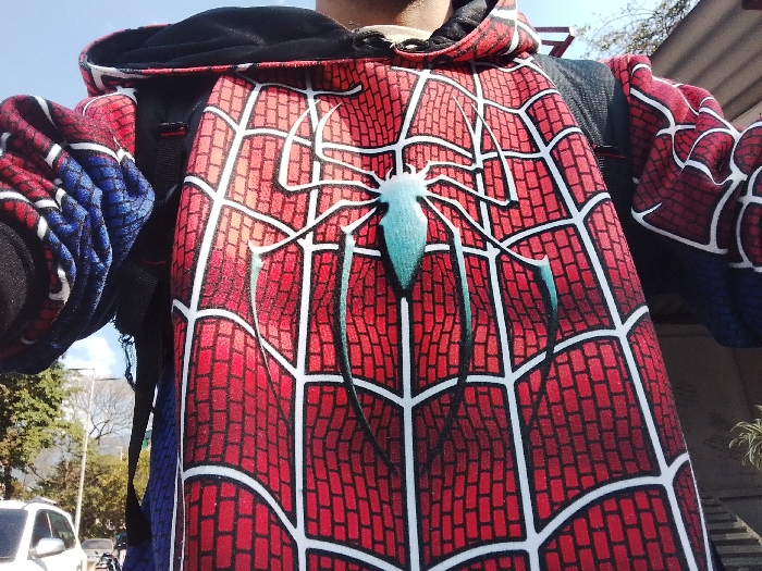 The image displays a close-up, chest-level view of an individual, whose face is not visible, wearing a hooded sweatshirt designed to resemble the Spider-Man costume