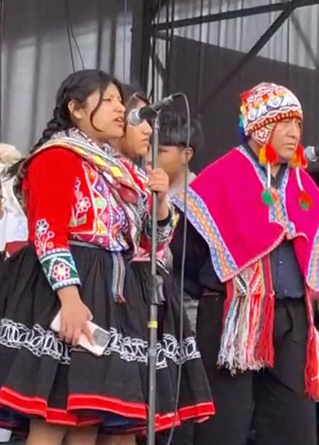 group of people performing on a stage. Two women are singing into microphones, one wearing a red embroidered jacket, black skirt, and braids, and the other with dark hair. A man stands beside them wearing a bright pink poncho and a colorful hat with pom-poms. Several other people are visible in the background, including a keyboard player and people watching. The stage is equipped with speakers, microphones, and stage lights. There are water bottles on the stage floor. The backdrop appears to be a curtain. The group seems to be performing traditional music.