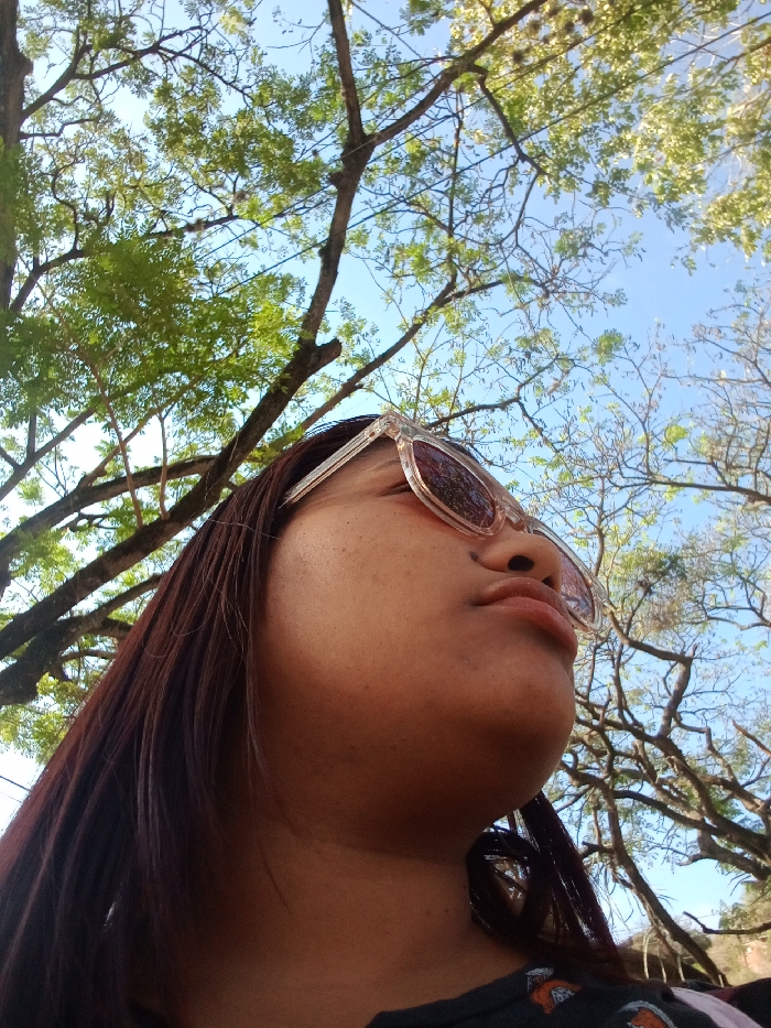 An outdoor, low-angle photograph, taken in Las Tejerías, Venezuela, depicts a single individual. The person, with medium-dark skin tone and dark brown hair, is shown from the mid-chest upwards, looking skyward. They wear clear-framed sunglasses with dark, reflective lenses. The mouth is closed, with lips slightly pursed. A dark-colored garment with subtle, light-colored patterns is partially visible on the lower right. The background features a clear blue sky visible through a dense canopy of trees displaying vibrant green foliage and bare branches, indicating an open-air environment under natural daylight.