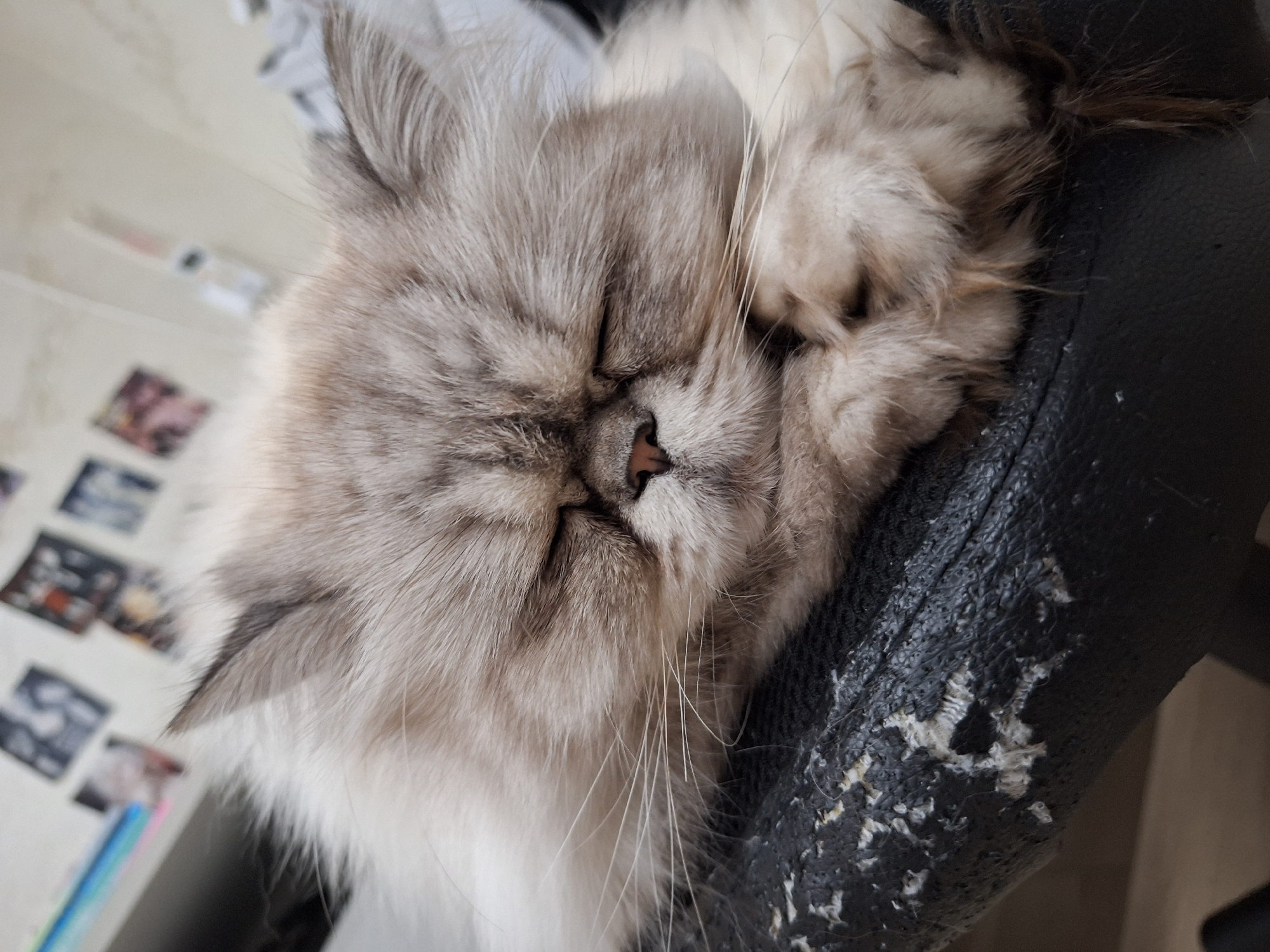 A fluffy, light grey and white cat is sleeping on a black, worn-out chair. The cat is positioned on its side, with its face nestled into its paws. The chair has significant wear and tear, with peeling or scratched material revealing a lighter layer underneath. The background is slightly blurred, but it appears to be a room with pictures or objects on the wall. There is no evidence to suggest the location is Panagyurishte, Bulgaria.