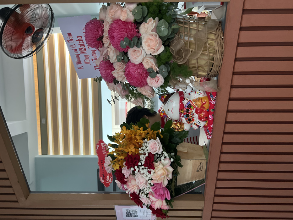 A floral arrangement with pink, peach, and white roses alongside fuchsia chrysanthemums sits in a basket. A Maneki Neko figure in a red patterned garment is nearby. A second bouquet displays yellow orchids, red roses, and white baby's breath in a wooden container. A small decorative tag in Vietnamese is attached. An electric fan is visible in the top left corner. The scene is framed by wooden structures.