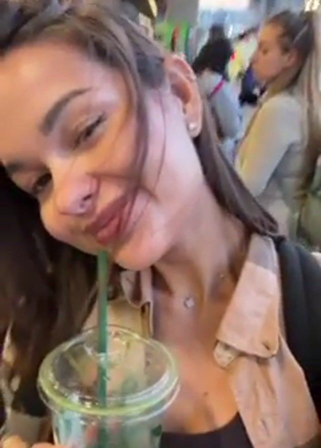 A young woman holds a drink in a Starbucks cup with a green straw. She stands in front of a crowd of people, many of whom are blurry. The setting appears to be outside, possibly an airport or similar transportation hub. She smiles at the camera while holding the drink. There is a yellow taxi in the background.