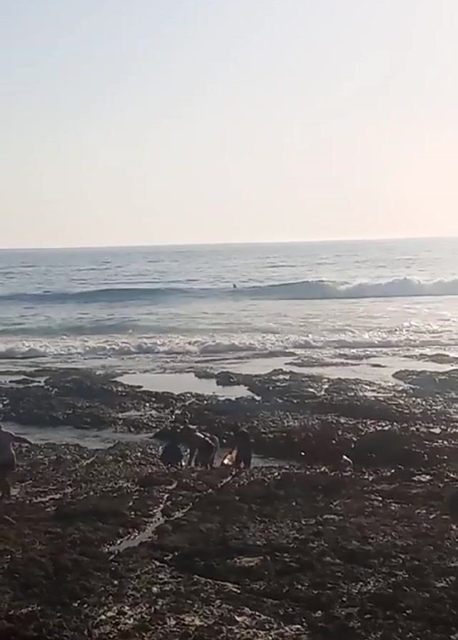 The video depicts a rocky beach with a group of people, likely adults and children, gathering near the tide pools