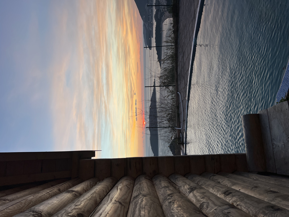 From a wooden porch, a scene unfolds. To the right, a pool reflects rippled water, bordered by tile and a fence. Across the water, landforms fade into the distance beneath a vibrant sunset, with hues of orange, yellow, and blue streaking across the sky. The sun, a bright red orb, dips below the horizon line. The image is presented in a slightly rotated perspective.