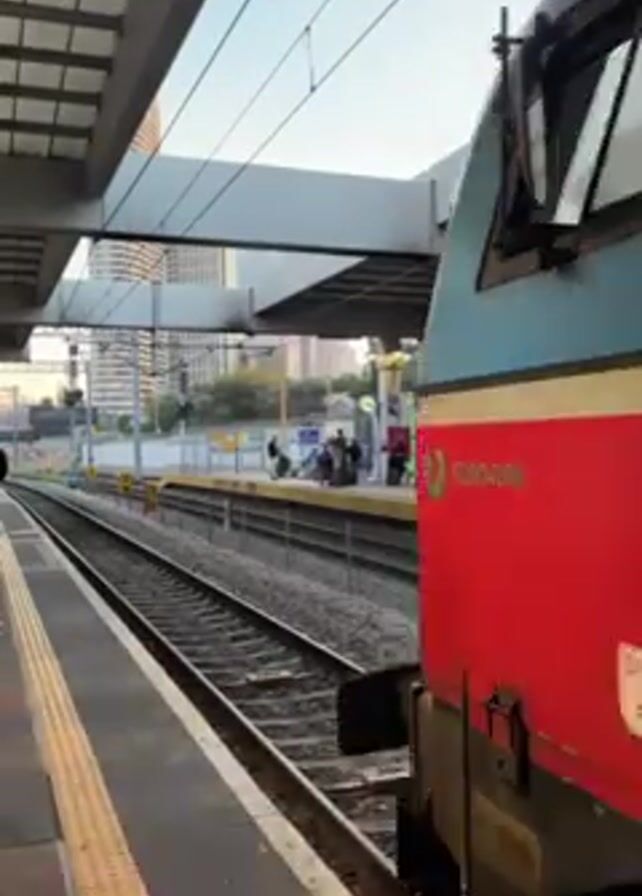 train passing through a station platform. The camera is positioned on the edge of a platform under a covered area. To the left are the train tracks. In the background, buildings stand against a sky. As the video continues, a train passes, its metallic exterior reflecting the ambient light. The train has red accents and a blue emblem. People stand on the platform, watching the train go by.