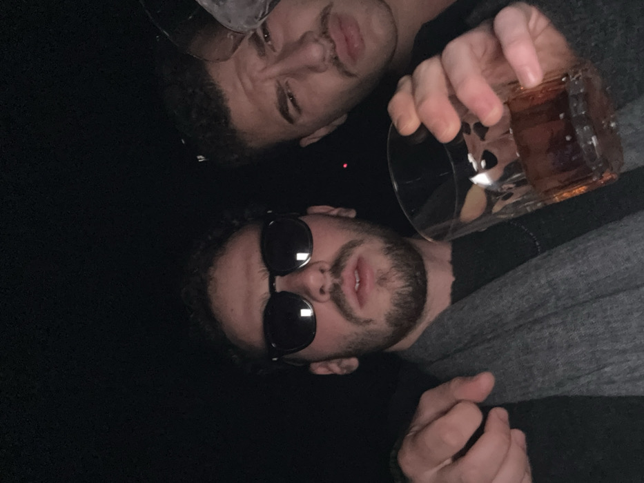 Two men are in a dimly lit setting, possibly a bar or a night out. One man wears sunglasses and faces the camera with a beard. The other, partially visible in the background, is holding a glass of amber-colored liquid. The perspective is angled, creating a sense of intimacy and closeness. Dark tones dominate the scene, with hints of gray clothing.