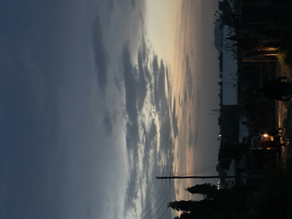 This image depicts a low-light outdoor scene in the city of Zango-ndaji, Nigeria, likely at dusk or dawn. The sky occupies the upper two-thirds of the frame, transitioning from dark gray-blue at the zenith to lighter grays, oranges, and yellows at the horizon, with scattered cloud formations. In the mid-ground, a utility pole with multiple overhead power lines runs vertically on the left. Below it, silhouettes of tall, slender trees are visible. To the right of the utility pole, a small vehicle, possibly a tricycle or compact truck, has its headlights illuminated, casting an orange glow on the unpaved ground. A person is visible as a dark silhouette walking from left to right in the foreground, near the vehicle's illuminated area. Another person, also a dark silhouette, walks towards the right side of the frame. On the far right, a wooden fence or barrier is partially illuminated by a faint light source. The background shows a discernible horizon with silhouettes of buildings and sparse vegetation. A tall, industrial-looking tower is visible on the left side of the background, and a distant elevated landform, possibly a hill or mountain, is present on the far right horizon. A large, light-colored rectangular structure, possibly a billboard or building, is prominent in the central background. Artificial lights from distant structures are faintly visible across the landscape. The scene is characterized by dim illumination and atmospheric haze.