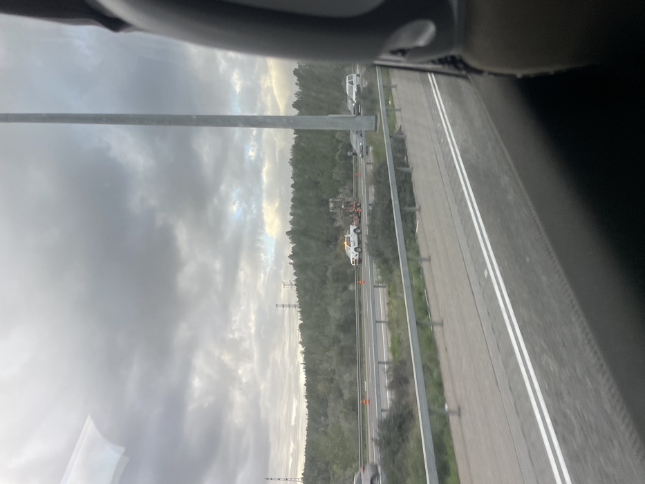 An overcast sky looms over a multi-lane highway, viewed from inside a vehicle. A line of trees borders the road. A white service vehicle with flashing lights is parked on the shoulder, attending to a vehicle being towed. Orange cones delineate a work zone on the shoulder of the highway. Transmission towers are visible in the background along the tree line.