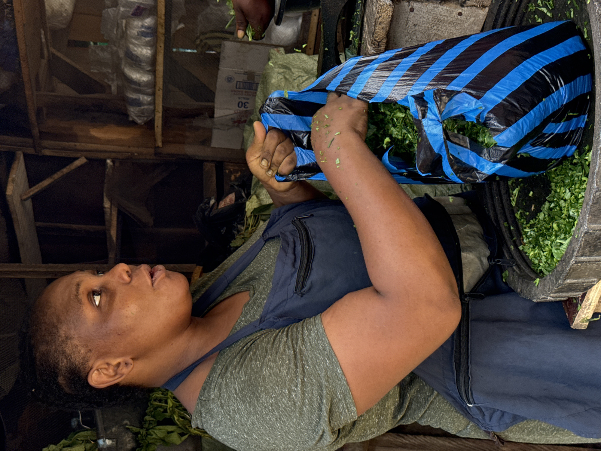 A woman is working in a market in Ado, Nigeria. She is filling a blue and black striped bag with green leafy vegetables from a large container. The market stall has a wooden structure behind her. There are plastic bags filled with items on the shelves behind her. A box labeled "30" is also visible.