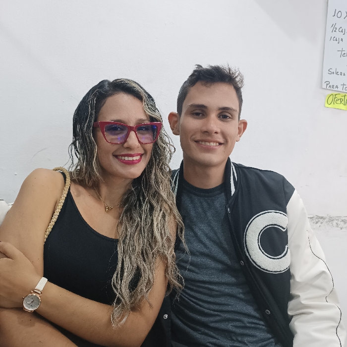 An indoor medium-shot portrait features two individuals, one female and one male, positioned side-by-side and smiling, set against a plain light-colored wall. The scene is located in Los Teques, Venezuela, likely within a commercial or office establishment. The female subject, on the left, appears to be in her 20s or early 30s, with long, wavy hair featuring both blonde and dark sections. She wears red cat-eye glasses with purple-tinted lenses and red lipstick. Her attire consists of a black spaghetti-strap top, a gold-colored necklace with a small pendant, and a white-banded wristwatch with a rose gold-colored casing on her left wrist. Her left arm is crossed over her body, and a light-colored braided strap, possibly from a bag, is visible on her right shoulder. The male subject, on the right, appears to be in his late teens or early 20s, with short, dark hair. He wears a dark grey t-shirt under a black and white varsity-style jacket that features a large white letter 'C' patch on the left chest. Both individuals are looking directly at the camera. The background, a plain light-colored wall, displays partially visible handwritten notes or signs on the right side. These include what appear to be numerical listings ("10x", "1/2 caja", "1 caja") and other text, along with a yellow sticky note clearly bearing the Spanish word "OFERTA" (Offer), which collectively suggest a retail or business environment. No further specific identifying features of the location within Los Teques are visually apparent.