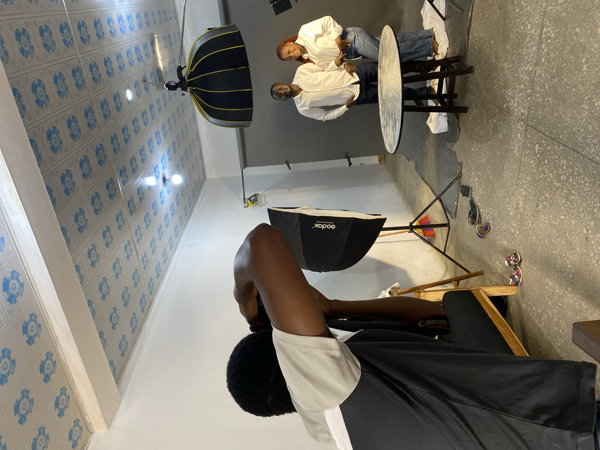 An indoor photography studio in Jos, Nigeria, is depicted during a photoshoot. In the immediate foreground, a Black male photographer, wearing a white, grey, and black short-sleeved top, is shown from behind, holding a black Canon DSLR camera to his eye. To the right, two Black individuals stand posing against a seamless grey backdrop. The male subject, with short dark hair, wears a white long-sleeved collared shirt and dark trousers, with his hands in his pockets and a smile on his face. Adjacent to him, the female subject, with reddish-brown braided hair, wears a white long-sleeved collared shirt and blue jeans, resting her right hand on the male's left arm while smiling. Studio lighting equipment is present, including a Godox branded softbox on a stand to the left of the subjects and a large black and yellow octagonal softbox suspended from the ceiling to the right. A dark wooden table, holding a circular silver reflector, is positioned in the mid-ground. The floor is light grey, speckled concrete or terrazzo, with a dark grey mat and a white cloth situated beneath the posing subjects. Multiple pairs of sandals are visible on the floor near the photographer's stool. The studio walls are white, and the ceiling features white panels adorned with a repeating light blue floral pattern, interspersed with recessed lighting fixtures. A broom is partially visible leaning against the wall on the far right.