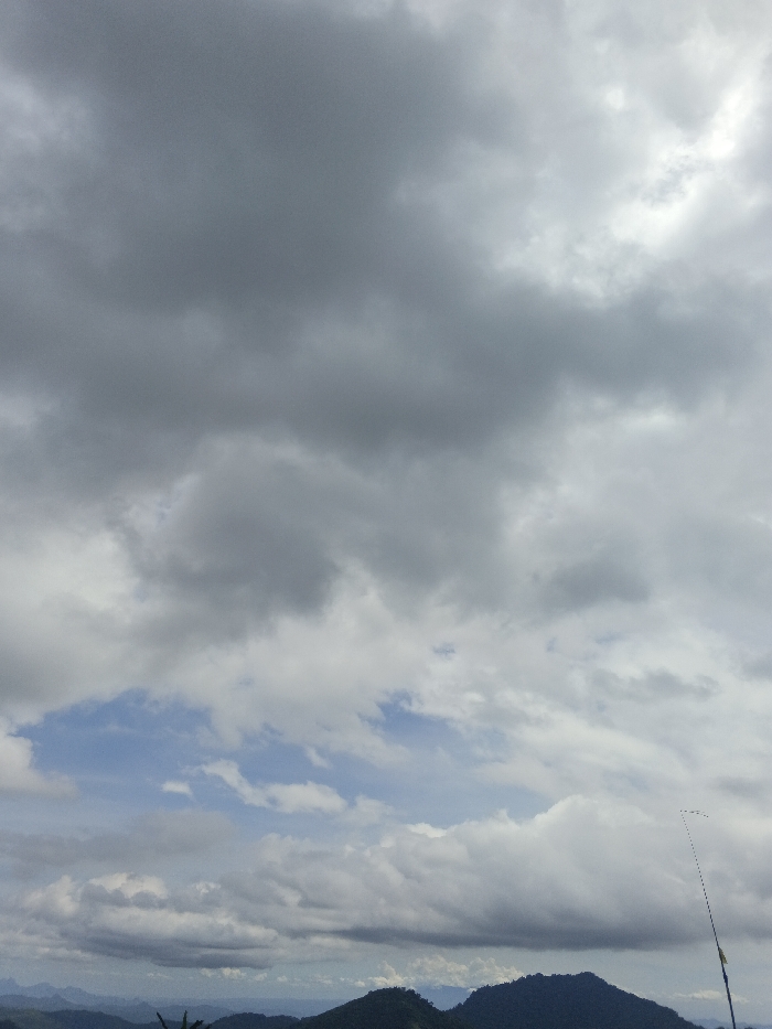 The image depicts a mountainous landscape under a partly cloudy sky in Ngọc Tụ, Vietnam. The majority of the frame is filled with an expansive sky, comprising various shades of grey and white stratocumulus clouds, with intermittent patches of clear blue sky visible, primarily in the lower-middle section. In the lower third of the image, multiple layers of dark green, forested mountains extend across the horizon, appearing hazy in the distance. A slender, dark pole or stick with a small yellow band near its visible base extends diagonally upwards from the bottom-right corner, terminating with a small, indistinct object at its tip and a faint dotted line stretching horizontally to the right. Minimal dark green foliage is visible along the extreme bottom edge of the frame. No individuals, animals, or explicit actions are discernible.