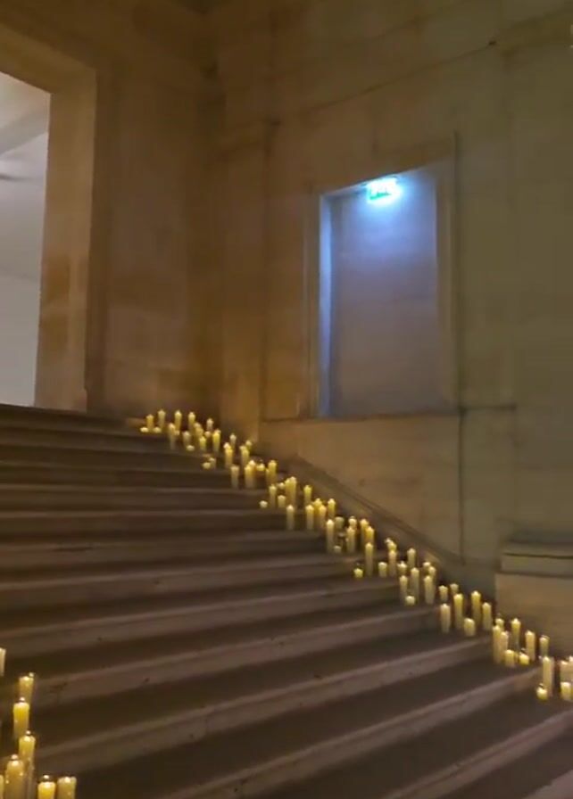 grand staircase illuminated by numerous candles on each step, leading to a hallway with a "GIVENCHY" logo backdrop