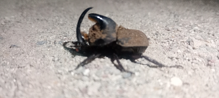 - "A rhinoceros beetle stands on a rough, light-colored surface" by FM-kzA8r2, licensed under CC BY 4.0