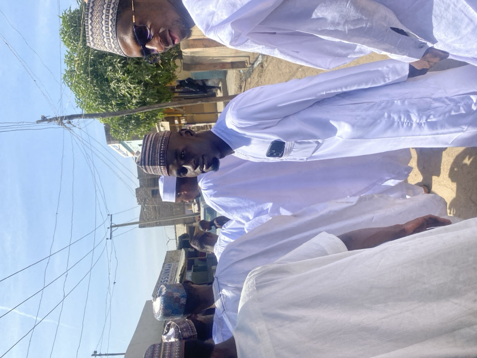 The image displays a daytime street scene in Chiranchi, Nigeria. A group of approximately ten individuals, primarily male, are present on an unpaved road. Most wear white robes and embroidered caps. A young man, positioned in the mid-ground, faces the camera directly, wearing a white robe with a black smartphone visible in his left chest pocket, and an embroidered cap. To his right, another young man, partially visible, wears a white robe, a similar embroidered cap, and dark sunglasses. Other individuals in identical attire are visible in the foreground and background, some facing away. The scene is brightly lit by sunlight, casting distinct shadows on the ground. Overhead, numerous power or communication lines crisscross a clear blue sky, supported by utility poles. Buildings line the street; a structure on the left features a visible sign with the text "SUNNAH," while a building on the right has a light-colored facade and is partially obscured by green foliage. A vehicle is partially visible in the distant background.