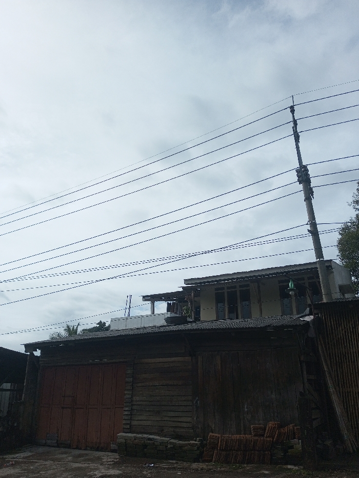 A utility pole with multiple wires stretches across a cloudy sky. Below, a two-story building appears, the top floor a lighter color than the structure below. A wooden garage-like building with two doors sits in the foreground, with some piled-up orange materials nearby. A portion of what appears to be a fence is on the right side of the frame.