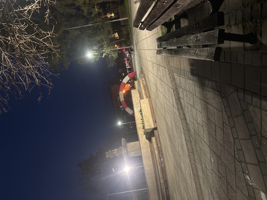 The image depicts Momina cheshma Square in Razgrad, Bulgaria, at night. The scene is illuminated by artificial light sources, including streetlights, which cast long shadows across the paved ground. The sky is dark blue-black. In the left midground, a multi-tiered stone fountain features a sculpture of two embracing figures at its apex. The fountain's lower levels include integrated planters containing sparse vegetation. A bright light source to the left of the fountain creates a significant lens flare. The ground is paved with light-toned rectangular and square tiles, interspersed with darker, narrower brick patterns forming linear designs. In the right foreground, two wooden park benches with dark metal frames are visible, one partially cropped. Moisture droplets are present on the slats of the nearest bench. Centrally positioned in the midground, a large, semi-circular arch, striped alternately in red and white segments, spans a paved pathway. Beyond this arch, a street with active red traffic lights is discernible. One indistinct human figure is visible on the paved area beyond the arch, near the street, either standing or walking. The right side of the image features tall evergreen trees, while bare deciduous tree branches are visible in the upper right quadrant. Distant buildings with some illuminated windows are visible against the dark horizon.
