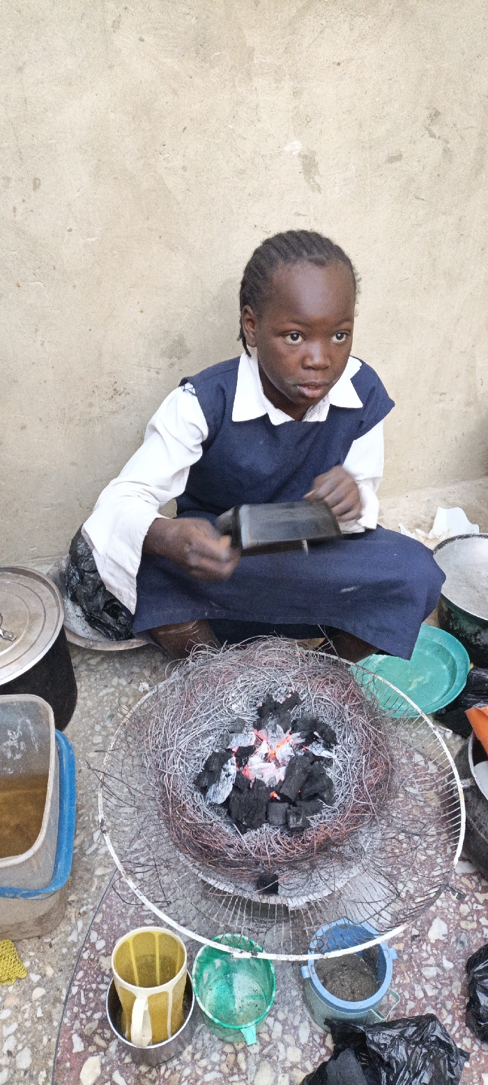 A young girl in a school uniform sits on the ground near a makeshift charcoal stove